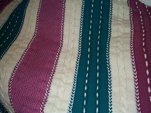 This afghan was machine knit on a chunky machine. The centre panel (pink one towards