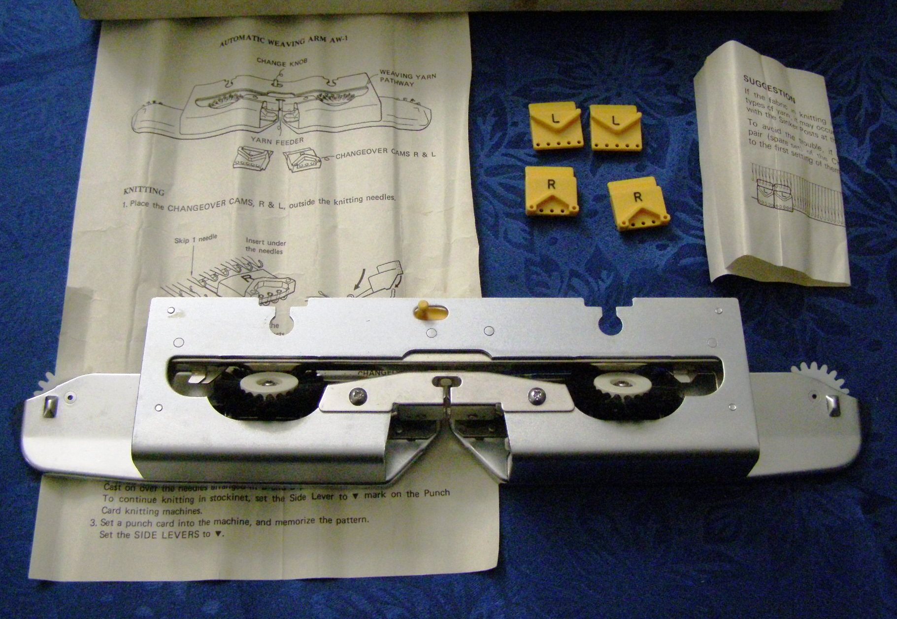 AW 1 Automatic Weaving Arm for the Studio/Singer/Knitmaster knitting machines fits all 3.6* & 4.5 machines (326 and newer)(also fits the 324) * AW-1 may be used on the 3.6 mm machines only if the fabric gears on the carriage arm are changed. Not for sale, for information only |