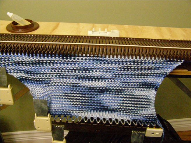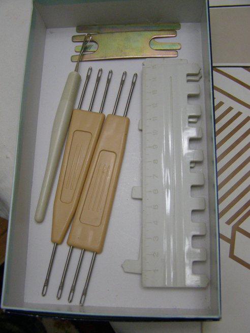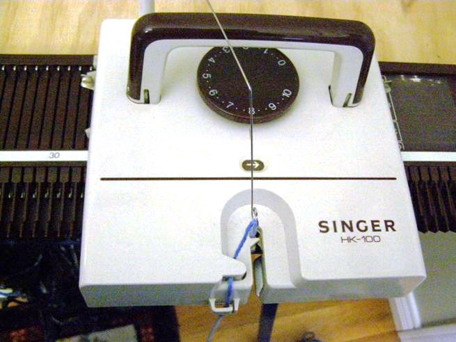 It's branded Singer but would be the same machine if branded Studio Very simple plastic bed machine but it does have a small mast for tensioning the yarn. 120 needles, 8 mm gauge machine, no ribber, manual pattern selection. |
