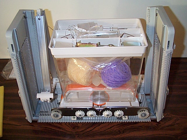 The MK 70 folded up and in its case. It's just a little larger than a sewing machine. This is an 18 st punchcard machine. No ribber was made for it. It's a 6 mm gauge machine. |