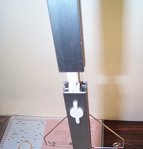 The tension post folds up and then locks into place. Above you can see (not too clearly, sorry) the innards. When you are folding it down again to put it away you pull up on it and then fold it down. |