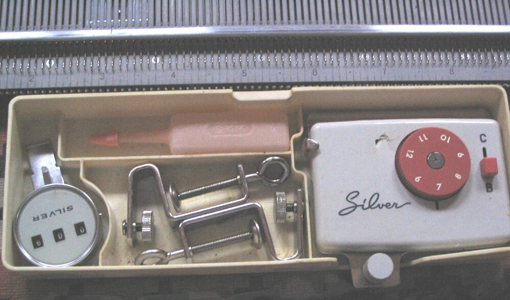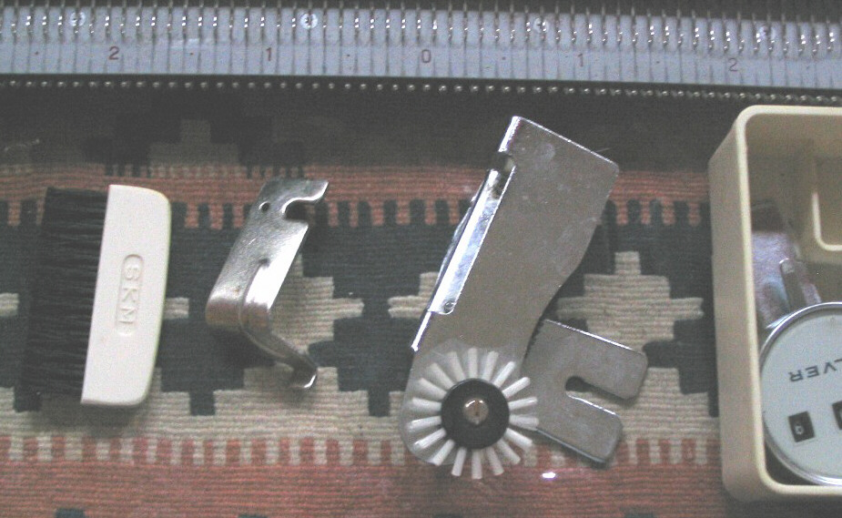 Tools. Left to Right. Metal needle pushers, 4 spare needles, latch tool (also known as a tappet