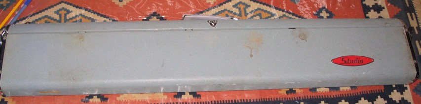 Carriage arm upside down in the lid. Behind is the rod and to the left is the tension mast.