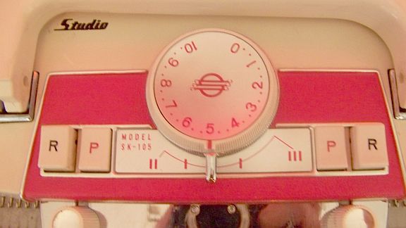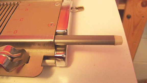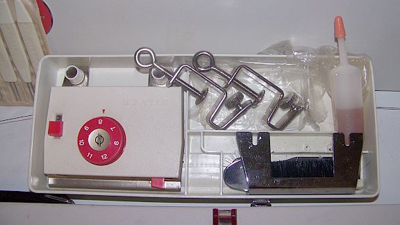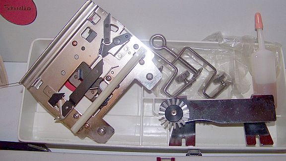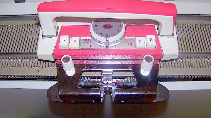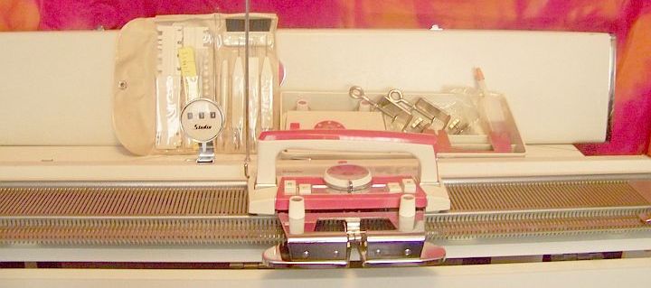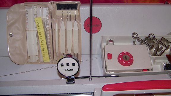 Here's a nice photo of the bed, the carriage with sinker plate attached, behind the carriage you can see the pattern maker and clamps and to the left of the carriage you can see the round row counter with tools behind. (No, the bed's not warped - it's just distortion from the camera) |