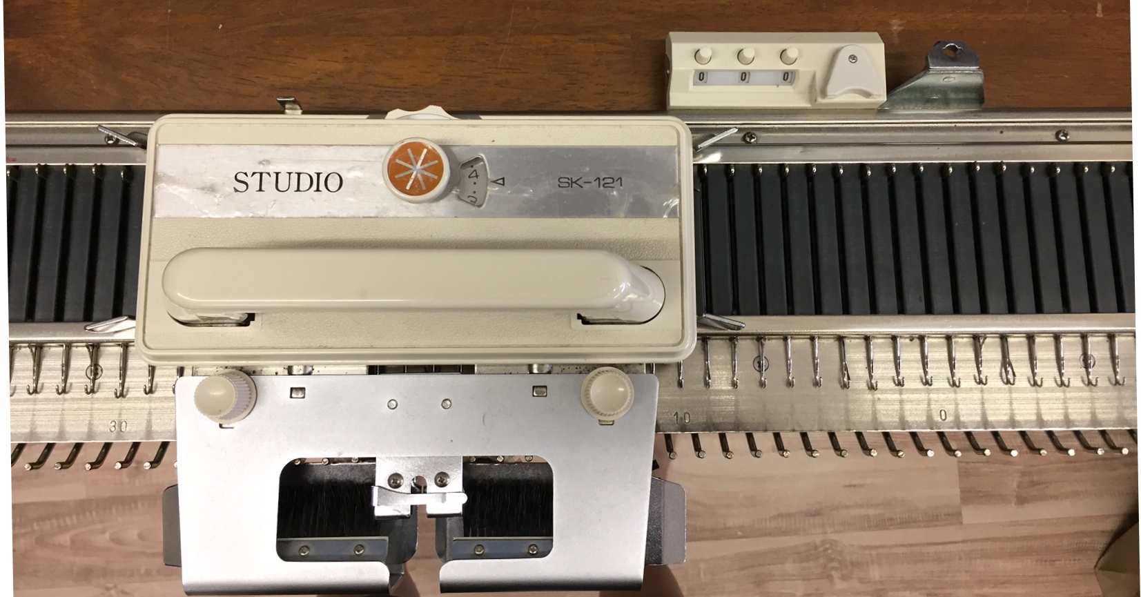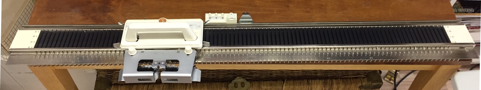 SK121 carriage on the needle bed with the row counter to the left behind. |
