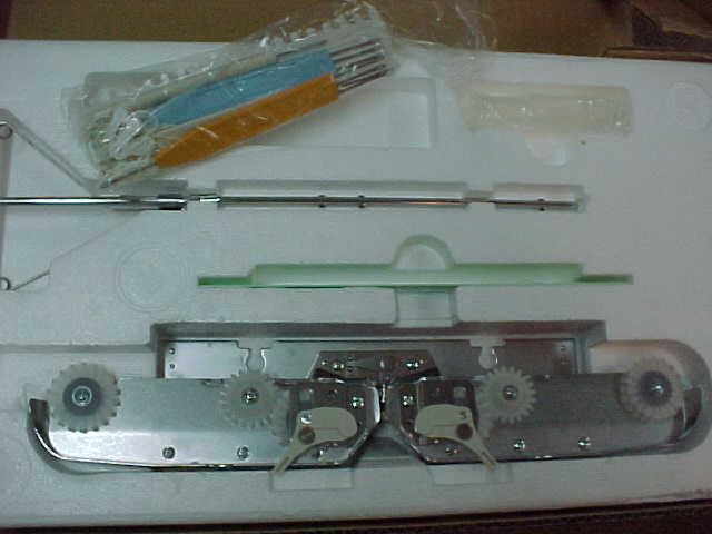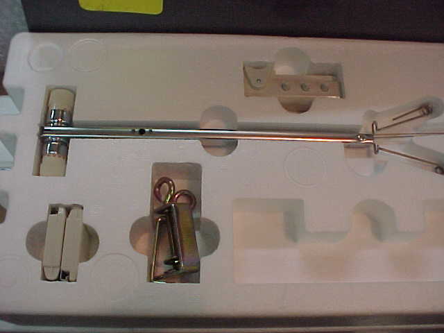 Styrofoam packing case showing row counter, tension mast, claw weights and flat clamps