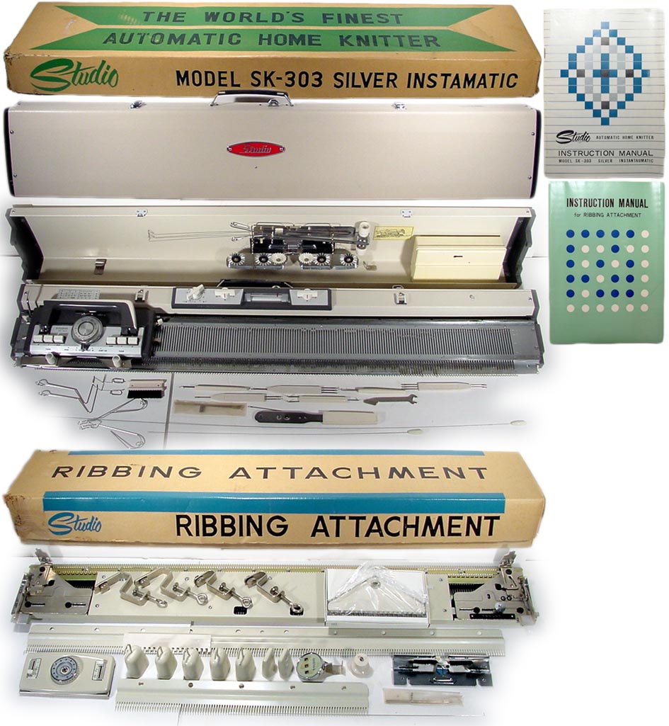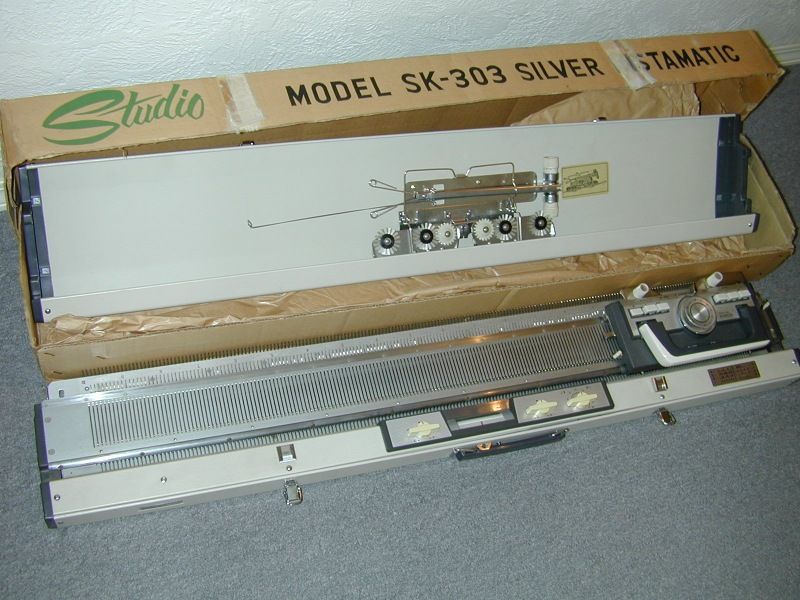SK303 needle bed with carriage (handle is down). In the lid you can see the arm and