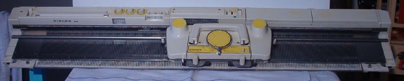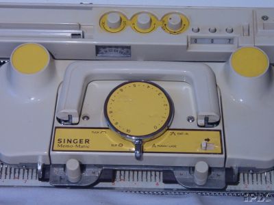 (radar). Photo on left is a close up of the carriage, handle still down. Behind is the row counter and the knit contour dials. |