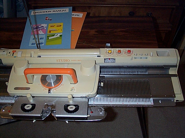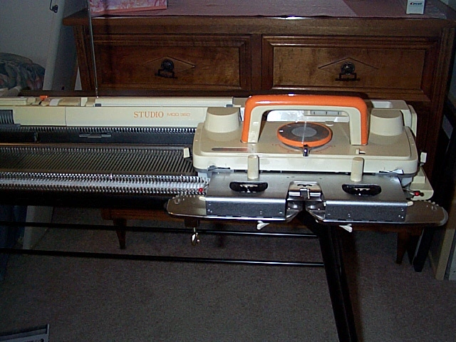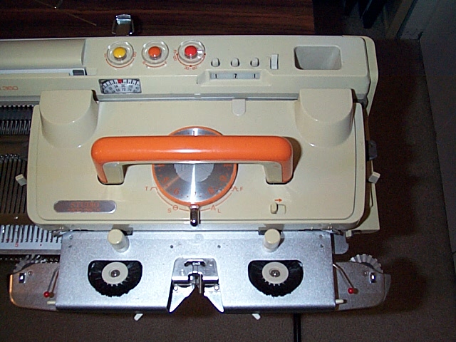 Carriage with the arm on. Behind is the row counter and dials for the knit