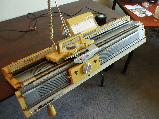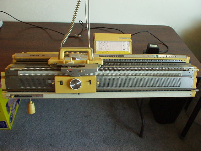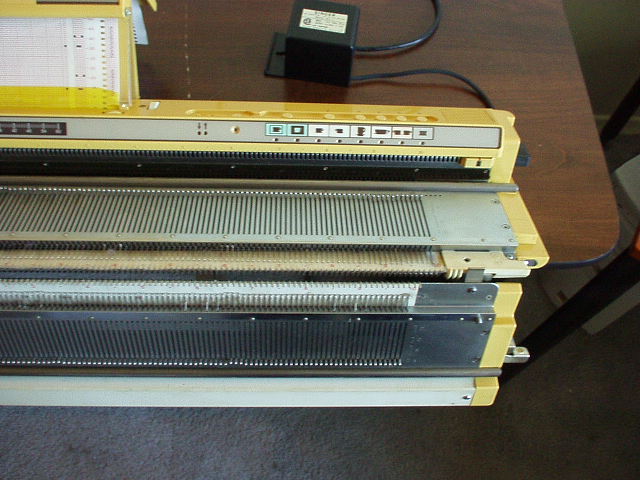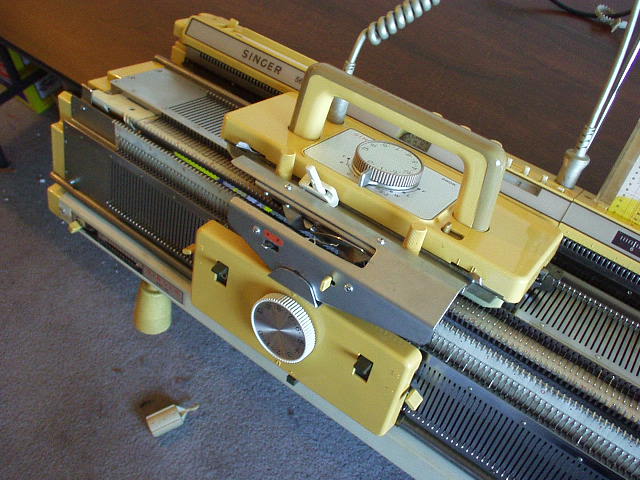 From the rear. Ribber covers. L to R, weights, ribber carriage, connecting arm. In front of ribber