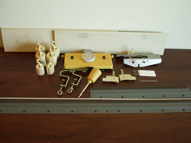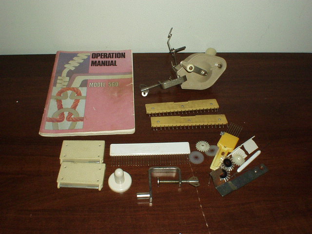 carriage, L to R, two clamps, racking handle, auxiliary pieces and tools. In front long and short combs. |