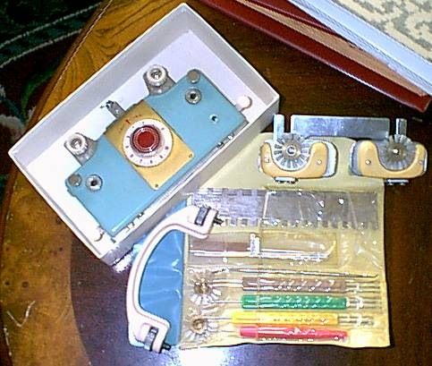 Carriage is shown top left - blue with red selector over gold colour. Arm is shown middle right - notice the gold colour trim around the brushes. Tools are under the arm in plastic case and handle for carriage is shown to the left of the tools. |
