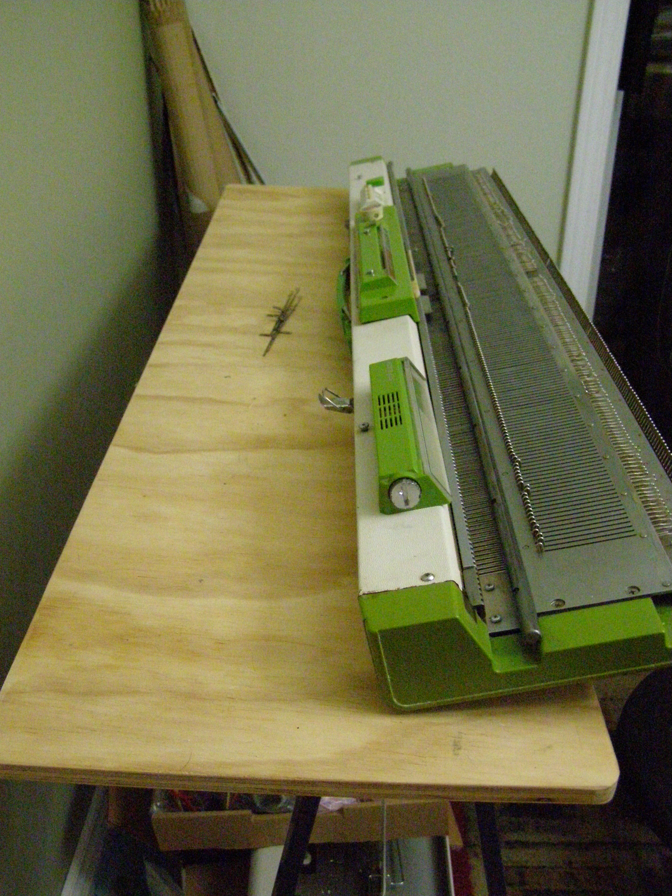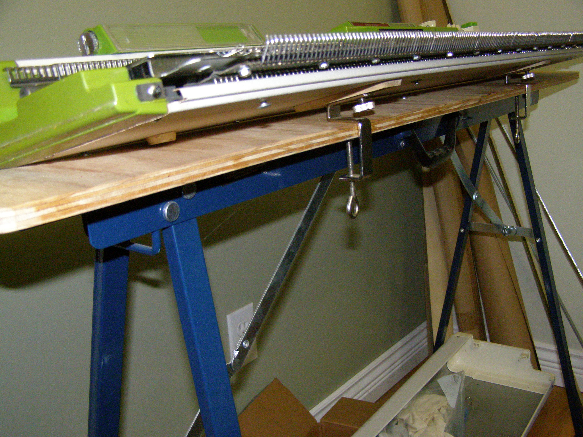 This is a metal saw horse sold in Canada in Canadian Tire. It comes on sale frequently. Screwed to the top is a piece of plywood 46 inches long by 12 inches wide and approximately 1/2 inch thick. The corners have been rounded and the whole piece of plywood has been sanded smooth. |