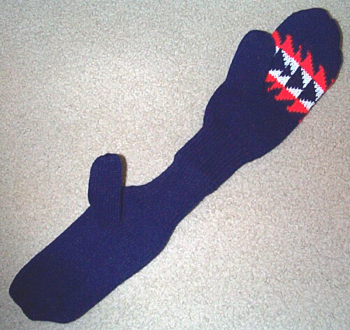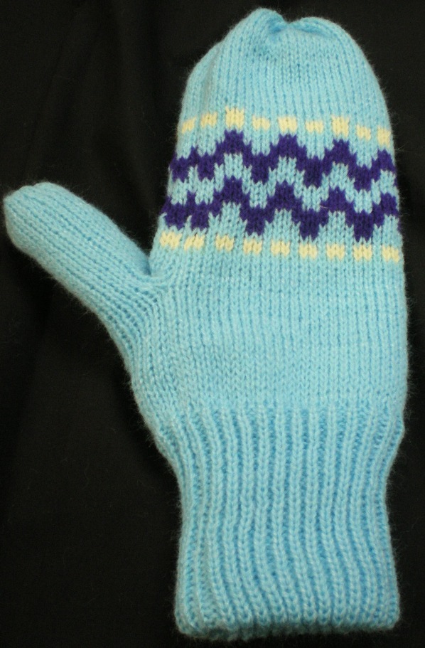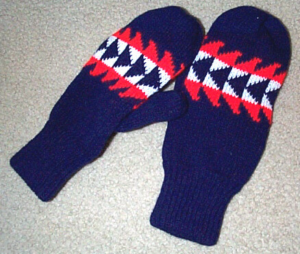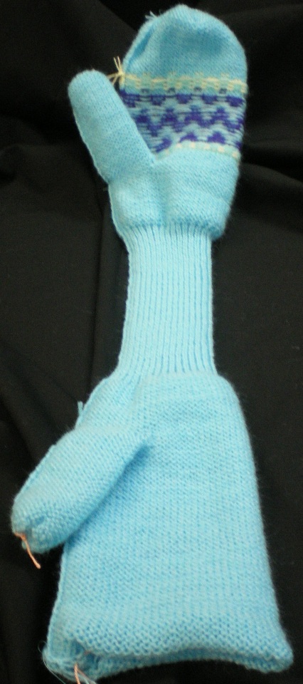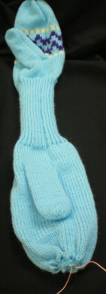 Here's how my double mitten looks after the seam is done and ends are caught in. I usually double check the seam where the thumb meets the side seam and using the cast on thread from the thumb sew it tight with a few stitches if there is a hole. Also in this photos I have tied the crochet cotton tight at the top of the mitten and trimmed it (not too short). |