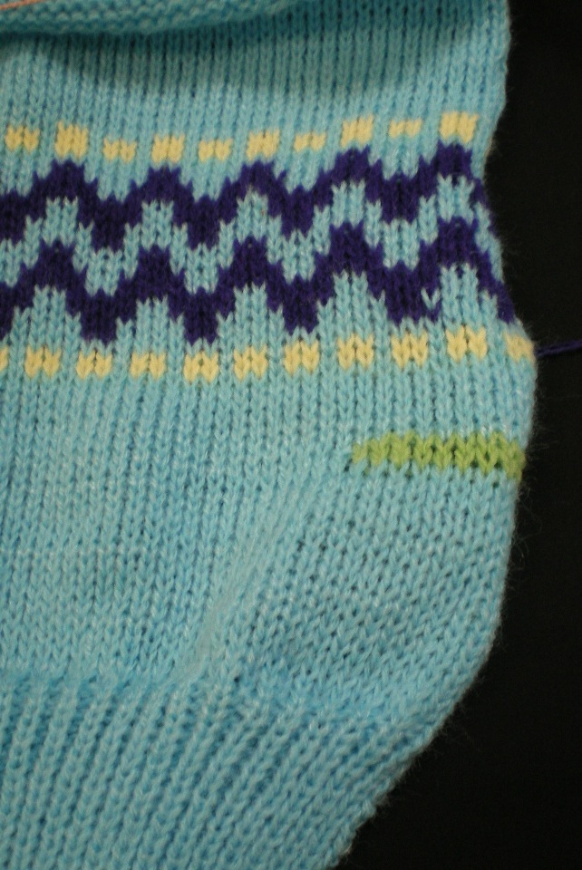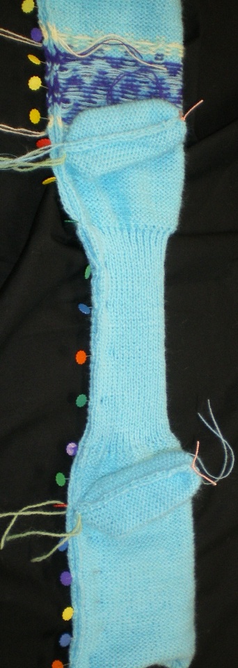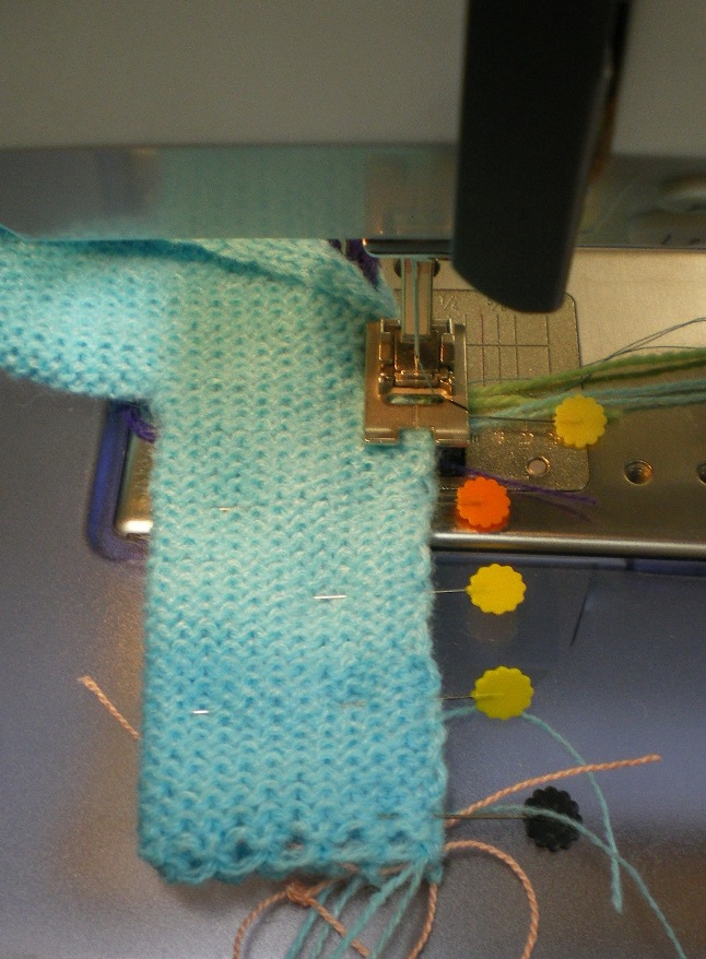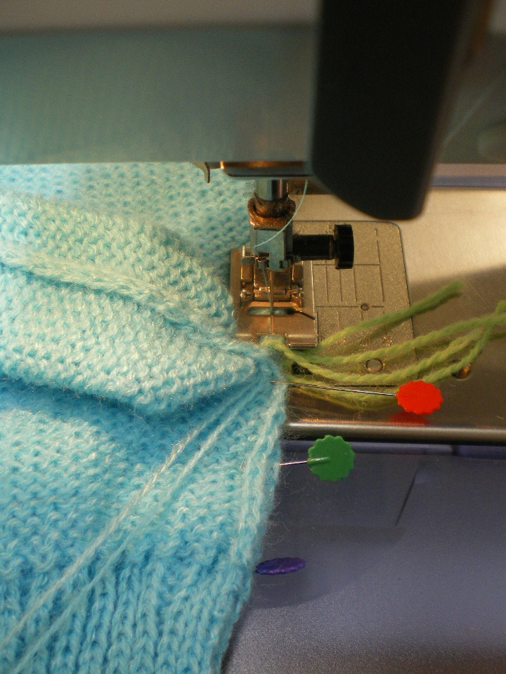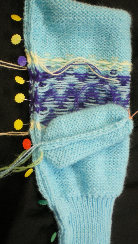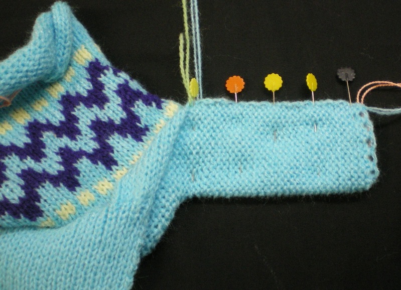 Match up waste yarn (that's the green yarn you see there) and the cast on yarn for the thumb (next to it), and then pin all the thumb ready to sew. |