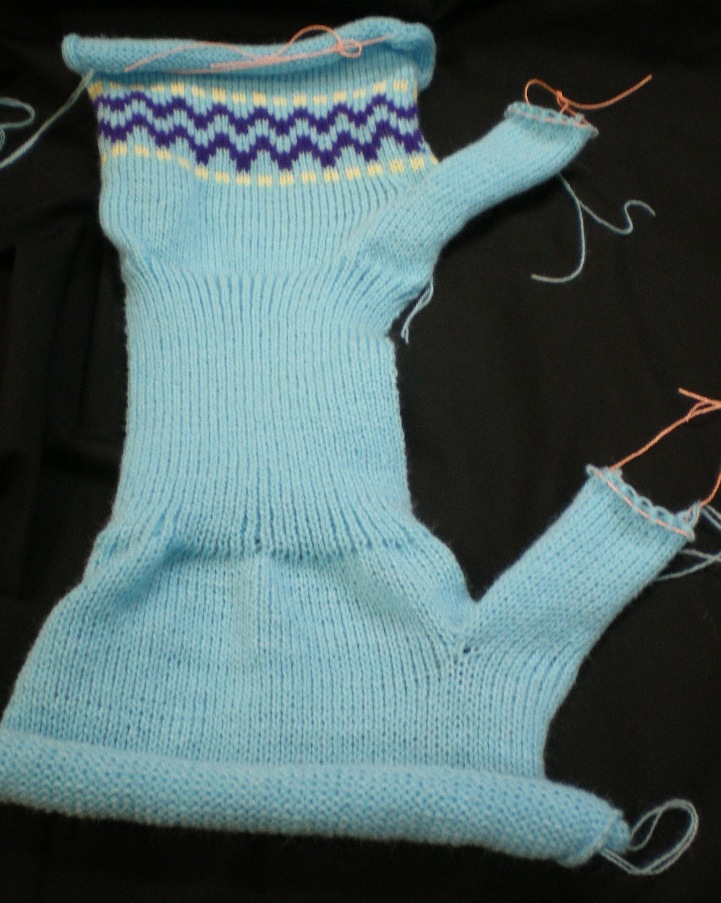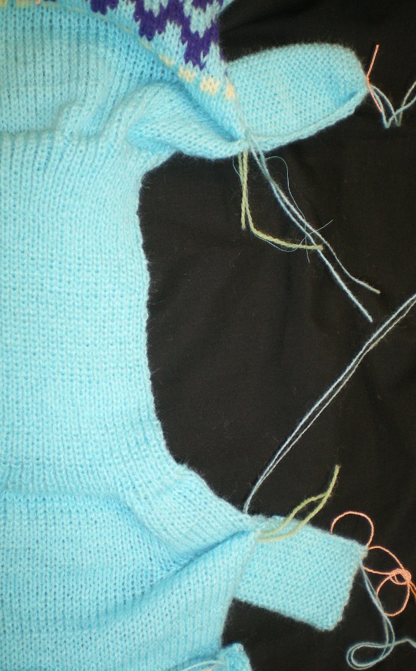 Turn your double mitten right side out and tie the crochet cotton at the lining end. Leave it two to three inches long and then using a bodkin pull it through to the wrong side. (The lining looks huge in this photo because it is closest to the camera). |