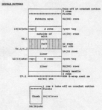 Tension | 30 sts and 37 rows to 10 cm, (4 inches), measured over stocking stitch. Tension dial setting approx., 8. outer layer and 7.. for lining. When using 4 ply adjust tension to get desired sts and rows (approx., T6 for lining and T7 for outer part of mitten. |
